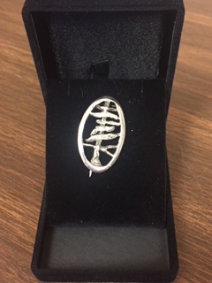 Description from the donor, Stephen Hastings: "My granddaughter, Bella Warner, is a sophomore at Sanford School. I enjoy working in different mediums. I work with wood creating musical instruments, stained glass and creating silver jewelry. The design of the piece is a stylized version of the Sanford logo. It is made of sterling silver and created for this fundraiser. Each piece of jewelry is made by hand. This particular piece was made using the lost wax process and cast in a fine plaster mold. The rough casting is removed from the mold and the finishing takes place. Sawing, grinding, shaping, and finally polishing, to bring the piece to its final state. I have donated this pin to the auction and hope that all who see it will enjoy it as well as bringing pleasure to the high bidder."